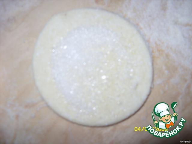 Раскатать тесто толщиной не более 5-7 мм, вырезать стаканом кружки. Кружки посыпать сахаром, сложить пополам 2 раза, чтобы получились конвертики. Украсить по желанию, я использую мак.