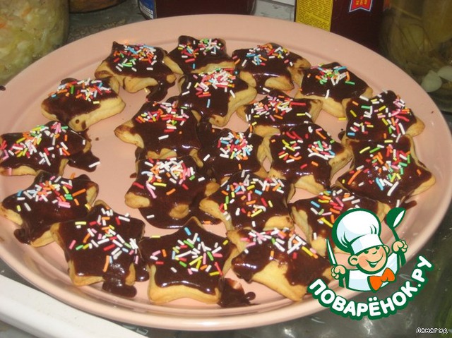 Полить глазурью печенье и посыпать кондитерской посыпкой.