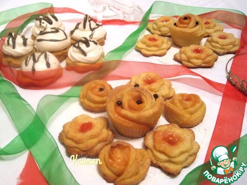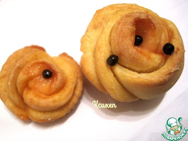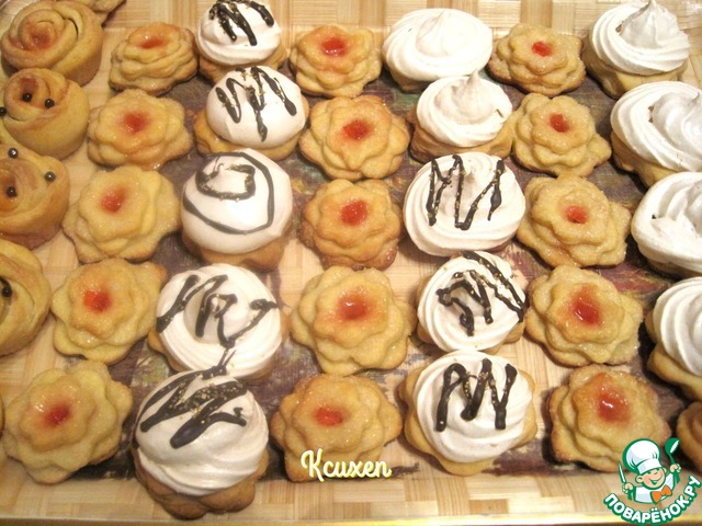 Из третьей части теста приготовим цветочки с безе. Здесь у меня была заминка-джем оказался слишком жидким. И что б он наверняка не вытек, мне пришлось загустить его крахмалом и сделать цветочки по типу ватрушки.