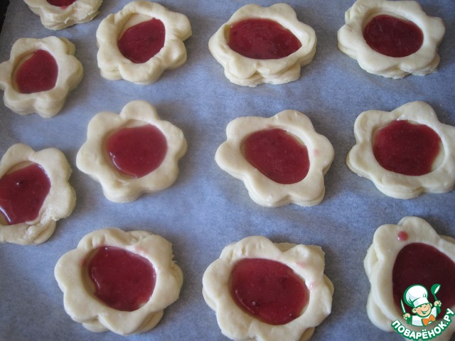 Вырезаем "донышки" и "бортики" для цветочных "ватрушек", скрепляем их с помощью белка. В получившееся углубление выкладываем немного малинового джема и запекаем 5-10 минут, что б джем загустился.