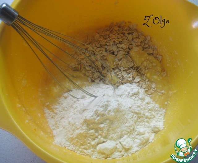 К тесту добавить разрыхлитель, соль, ванильный сахар, овсяные хлопья и половину нужного объема муки. Хорошо вымешать венчиком.