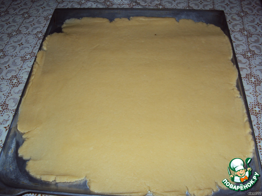 Раскатать тесто скалкой на смазанном противне. Края не обязательно должны быть ровными, мы их будем потом обрезать.