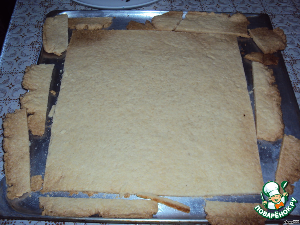 Пока корж горячий, ровно обрежьте края.