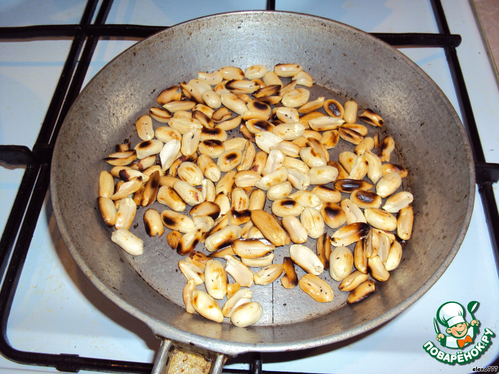 Теперь очищенный арахис обжарьте до золотистого цвета. Правда, у меня произошла небольшая оказия: я поставила орешки в сковороде на огонь, а сама стала заниматься тестом, вспомнила я об арахисе только тогда, когда запахло "жареным"! :-D