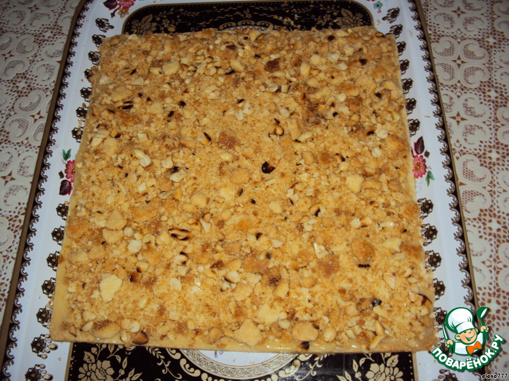 Сверху насыпать крошку из обрезков коржа, смешанную с рубленым арахисом и прижать рукой к основе.