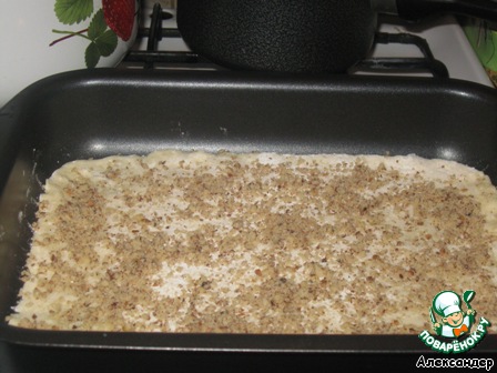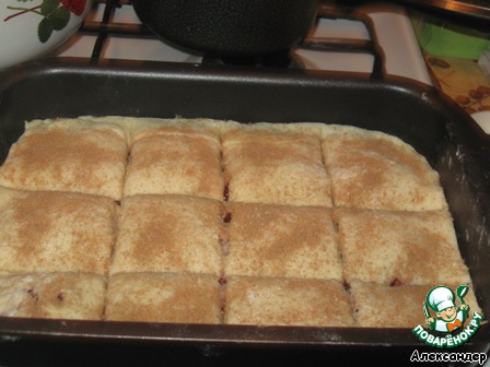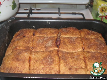 Третьим коржом закрываем всю "конструкцию". Надрезаем на квадратики и посыпаем сахаром с корицей.