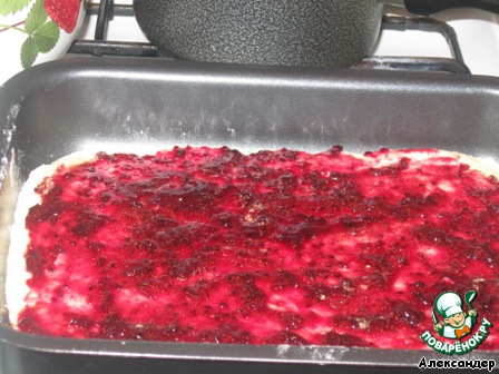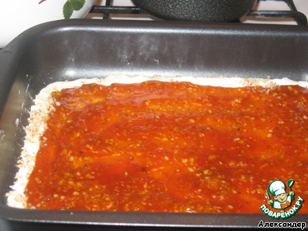 Кладем в форму на первый, посыпаем густо корицей и мажем черно-смородиновым джемом.