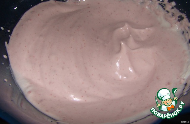 Крем.Взбиваем белок в крутую пену .По одной ложке добавляем варенье (У нас клубничное).продолжая взбивать