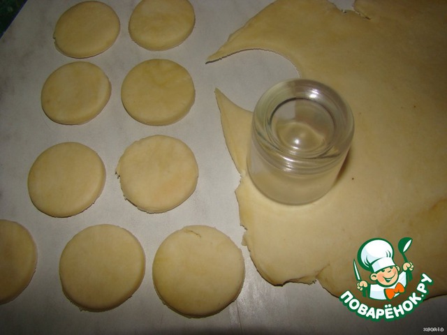Затем раскатаем его в пласт примерно 3-4 мм толщиной и вырезаем кружочки примерно 3- см в диаметре