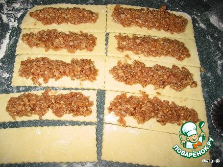 Тесто поделить на 2 части, раскатать лепешку не толще чем 1 см, подравнять чтобы получился прямоугольник, затем порезать на маленькие прямоугольнички размером с будущие "папироски", в центр по всей длине выкладываем начинку толщиной с палец (удобно это делать руками).