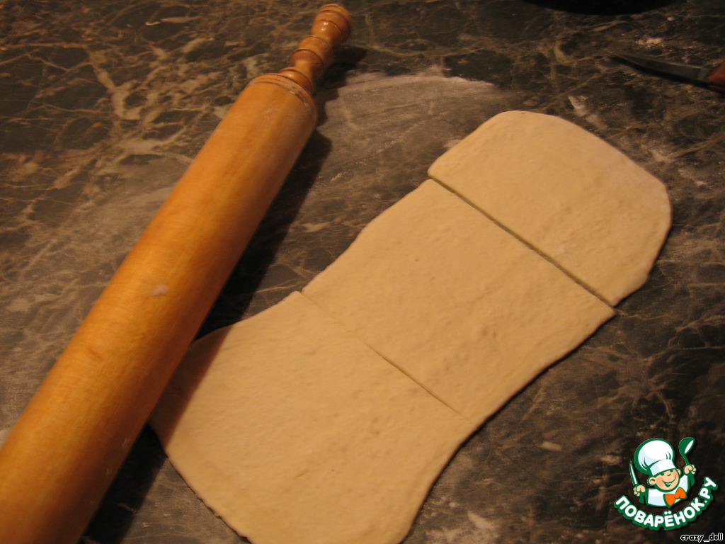 Одну пятую часть теста раскатываем до толщины 5 мм, разрезаем на три части.