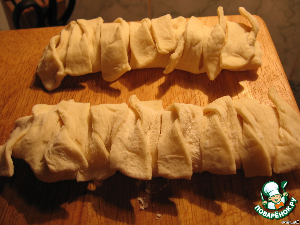 Тесту (если как у меня - покупное) дать подняться. Я разрезаю тесто на 5 частей, как на фото и раскатываю каждую часть по отдельности. Их каждой части получается три штуки печенья.