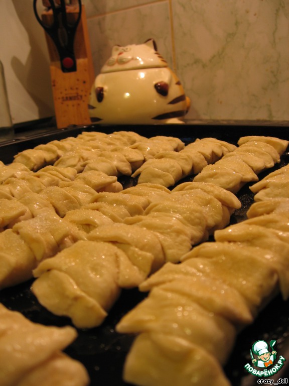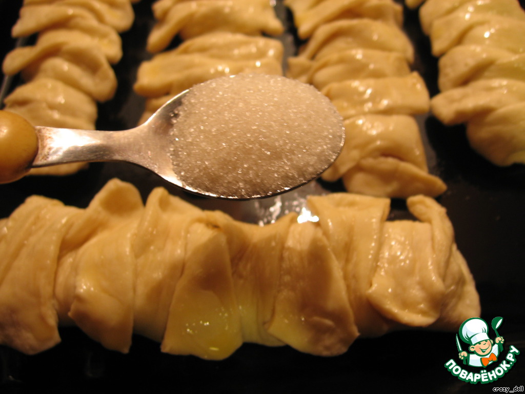 Укладываем печенье на смазанный маслом противень, смазываем взбитым яичным желтком и присыпаем сахаром (сахар не жалейте).