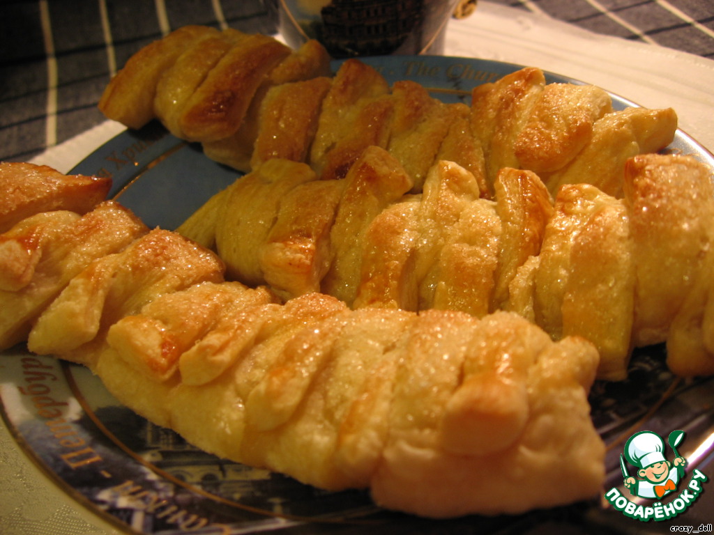 Затем закрываем начинку бахромой, перекрещивая с двух сторон, как на фото. Сильно прижимать не нужно, просто положить бахрому из теста сверху начинки крест-накрест.