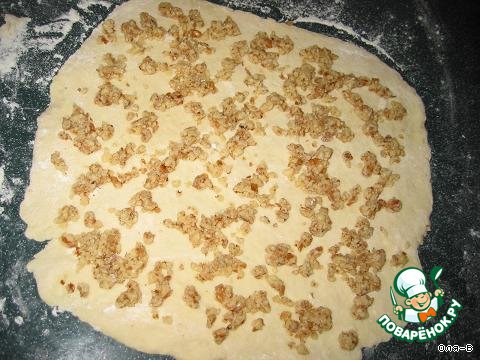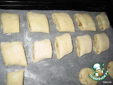 свернуть не туго в рулет,слегка приплюснуть и порезать наискосок на кусочки шириной не меньше чем 5 см.Так же поступить со второй половиной теста и остальной начинкой.Уложить рулетики на расстоянии друг от друга на противень,при желании смазать яйцом,сделать в середине каждого рулетика по одному проколу зубочисткой.