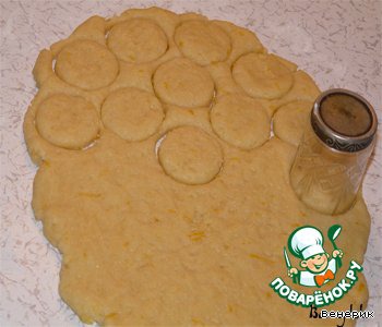 Раскатать тесто в пласт 1 см., вырезать рюмкой печенюшки.