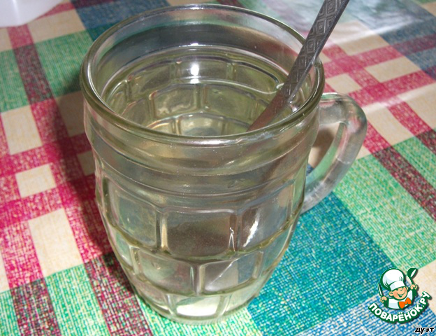 Наливаем в стакан 200 мл холодной воды, в него добавляем 1 ст.л уксуса (у меня яблочный) и 0,5 ч.л соли. Всё перемешиваем и отставляем в сторону.