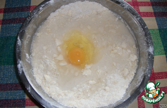 Добавляем в сухую смесь 1 яйцо, вливаем жидкость и замешиваем тесто.