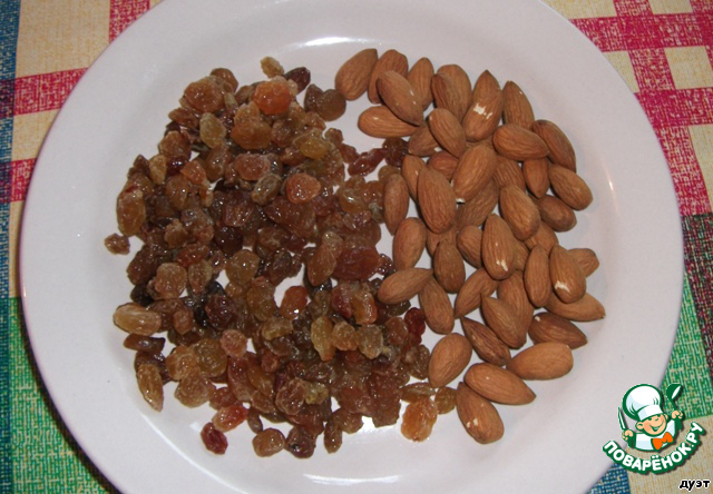 Пока приготовим изюм и орешки. Начинку можно делать просто с одними любыми орешками или просто с изюмом.