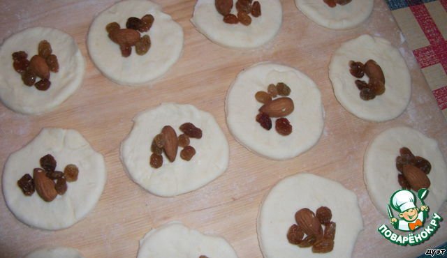 Раскладываем начинку (по одному орешку и несколько изюминок) Можно добавить на кончике чайной ложки сахар. Я не добавляла, изюм очень сладкий.