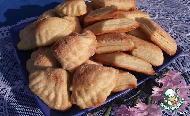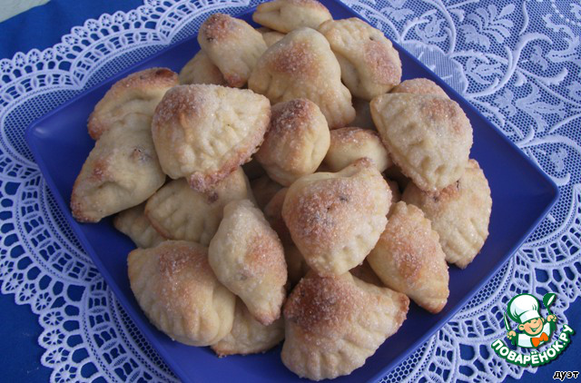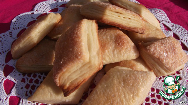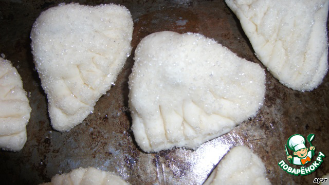 Складываем в "ракушку" (пополам и ещё раз пополам). Края прижимаем вилкой и обмакиваем верхнюю часть в сахар.