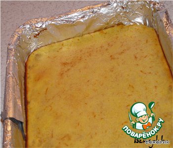 Форму размером 33см*22см застелить фольгой так, чтобы края свисали. Бока смазать сливочным маслом, (не дно).