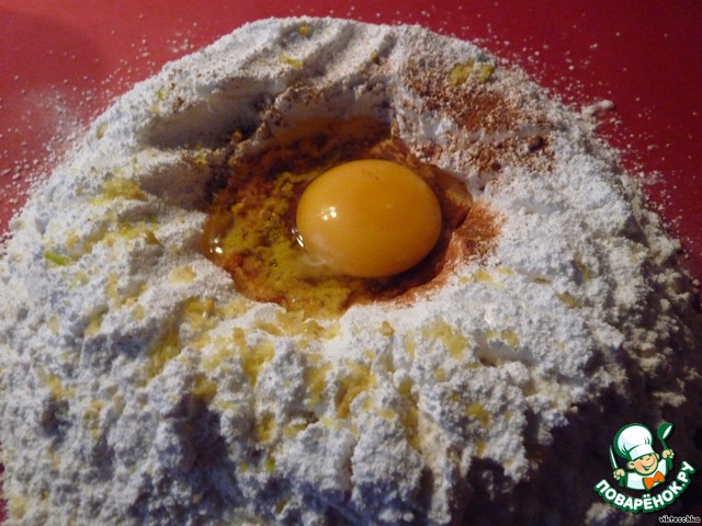 Просеиваем муку и пудру. Делаем углубление и вбиваем яйцо. Добавляем цедру лимона, ванилин и корицу.