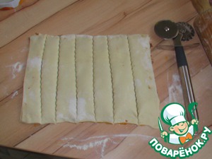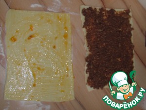 Слоёное тесто положить на пекарскую бумагу и половину намазать ореховой массой (у меня были кусочки слоёного теста, я просто брала один пласт, намазывала ореховой смесью, а второй, одинаковый по величине - абрикосовым конфитюром и потом накрывала один пласт другим).