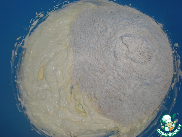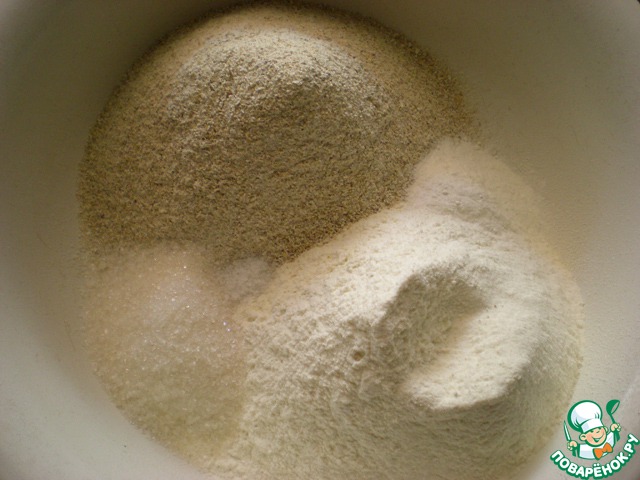 Просеять овсяную и пшеничную муку, добавить разрыхлитель, соль и сахар.