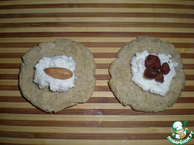 Достаем наше тесто из холодильника. Из шарика рукой разминаем лепешку и в середину кладем чайную ложку творожной начинки, сверху ставим орех или ягоды из варенья.