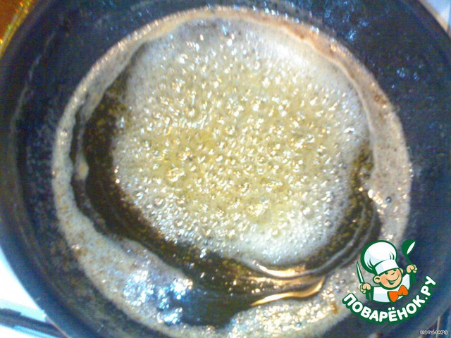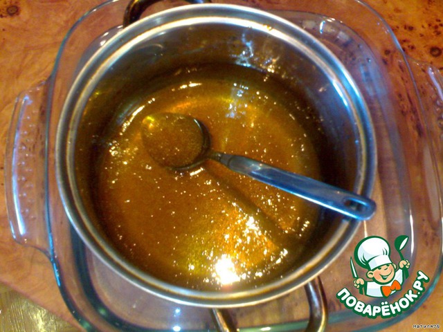 Пока шоколад застывает, варим медовую карамель. 1 стакан сахара, 50 мл меда и 0,5 стакана воды варим на среднем огне до загустения. Затем, кастрюльку ставим в холодную воду, чтобы карамель сильнее загустела.