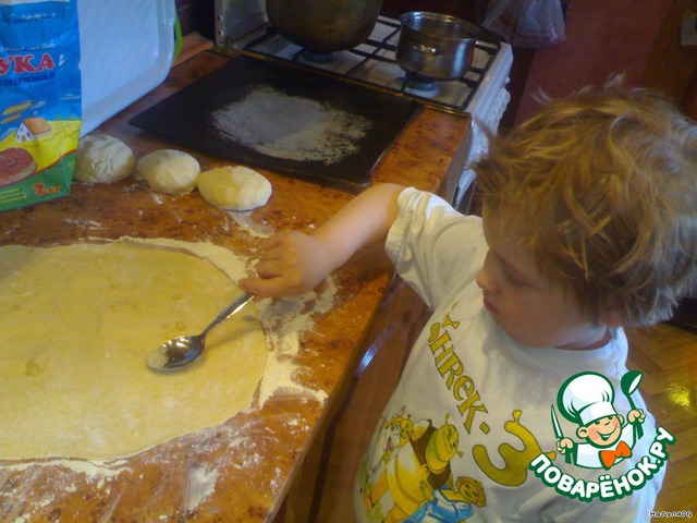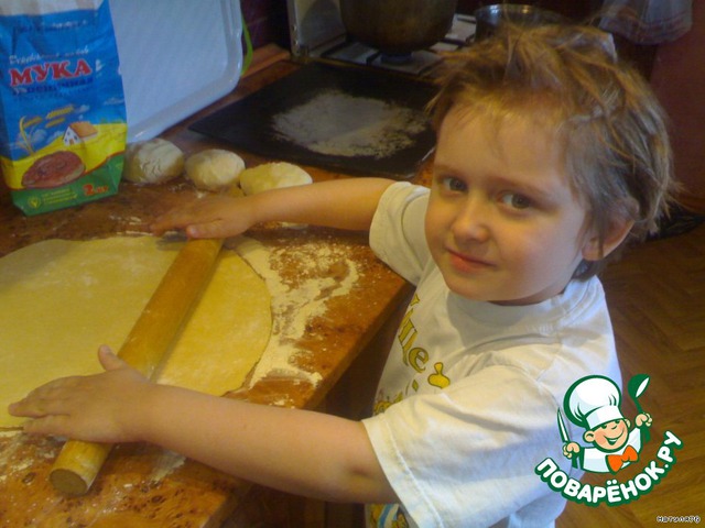 Берем одну часть теста, раскатываем. Яр, как всегда, очень старается!
