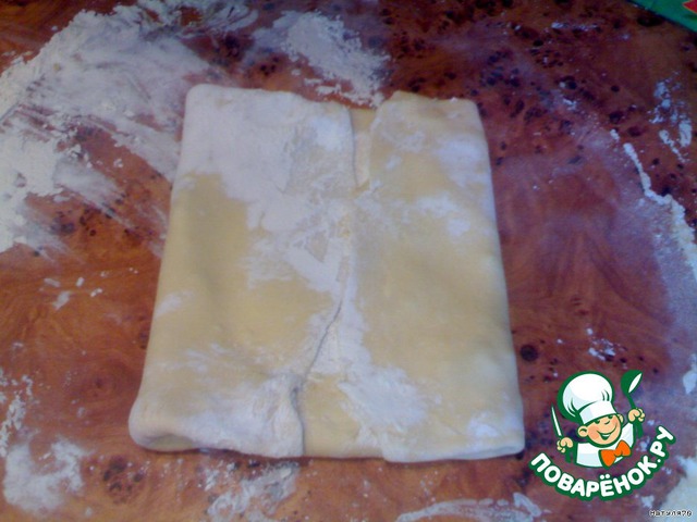 Складываем конверт. Затем его еще один раз раскатываем и выкладываем вторую часть начинки. Раскатываем еще раз, но не очень тонко. Около 1 см толщиной. Проделываем тоже самое с остальным тестом.