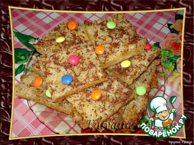 Готовое тесто раскатайте в прямоугольный пласт толщиной примерно в 7 мм, уложите на противень, смазанный растительным маслом. Выложите сверху ровным слоем начинку. Выпекайте в заранее разогретой духовке 20-30 мин. при температуре 200градусов. Горячую готовую заготовку посыпьте тертым шоколадом. Охладите, нарежьте прямоугольными кусочками. Печенья готовы!