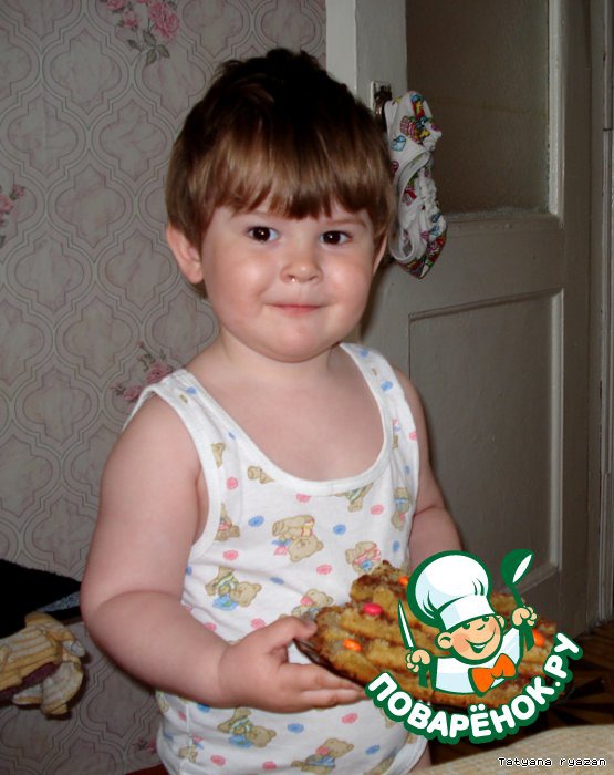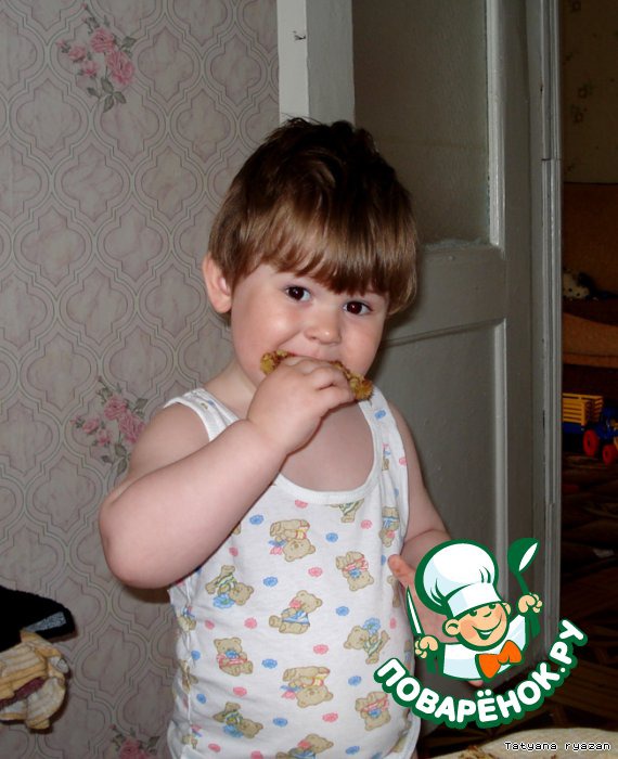 Поучаствовать в приготовлении этих печенюшек сынишке не удалось, так как я их готовила пока он спал. Но с радостью сфотографировался уже с готовыми печенюшками.