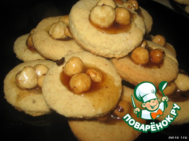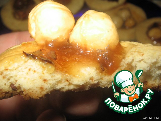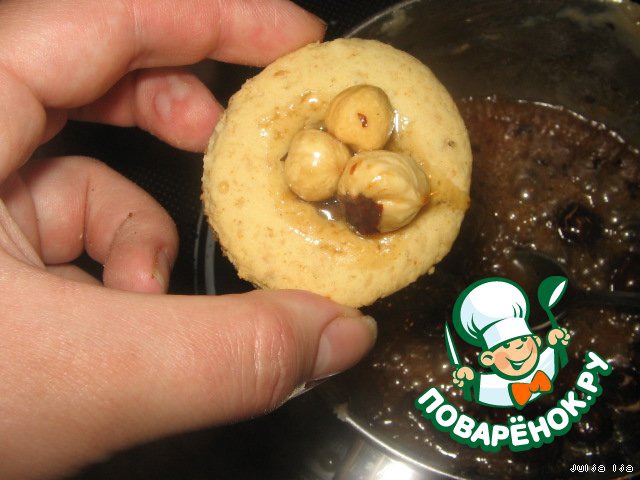В центр печенья (в углубление) кладём по три орешка и немного карамели. Карамель при этом должна стоять на плите, на самом маленьком огне, чтобы она не загустела. Если вдруг сильно застынет (орешки станут, как бы в белой глазури), добавить немного воды и ещё проварить.