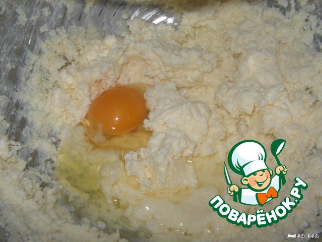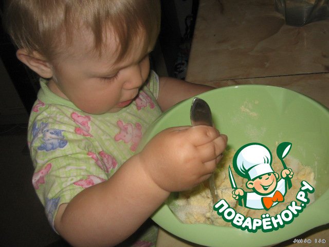 Масло (100 гр) растереть с сахаром (0,5 стакана) и щепоткой соли. Это вполне можно доверить ребёнку. Даже такому маленькому. Правда, потом маме пришлось собирать остатки масла с сахаром по столу, отмывать и переодевать ребёнка, использовать другую посуду для приготовления, так как эту забрать у ребёнка уже было невозможно. Но зато весело!!!