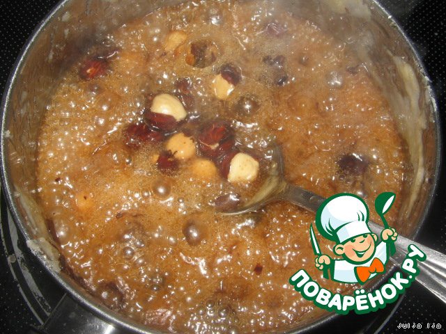 Затем всыпаем орехи. Лучше, если они будут уже чищеные и обжаренные. Мне достались такие, что даже после жарки полностью снять шкурку с них я не смогла. Но на вкус это не повлияло :-)