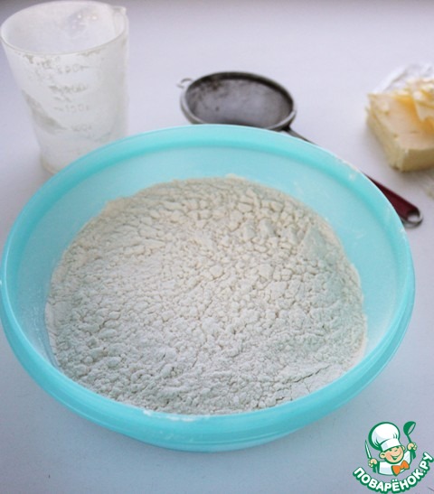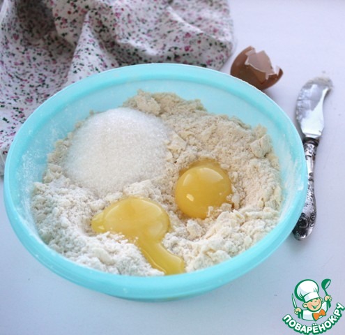Добавить к муке мягкое масло, порубить его ножом и затем быстро перетереть руками до крошки.