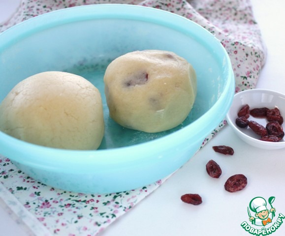Замесить тесто. Разделить его на 2 части. В одну часть добавить вяленую клюкву и убрать в морозилку