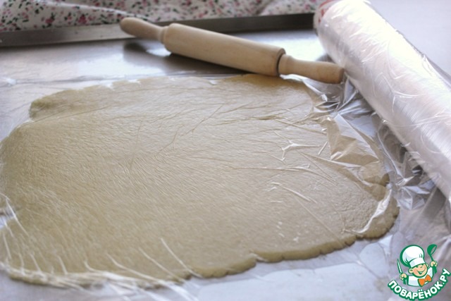 Противень смазать растительным маслом, выложить вторую часть теста, расплющить его ладонью, накрыть пищевой пленкой и тонко раскатать. Неровные края подравнять руками, тесто мягкое, послушное. Постараться придать тесту прямоугольную форму.