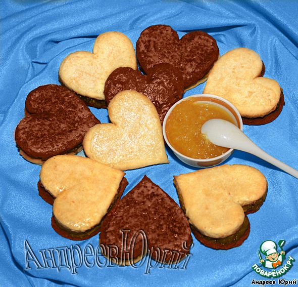 Через 25 минут достанем печенье из духовки и при помощи любимого джема соединим темные и светлые сердечки вместе.