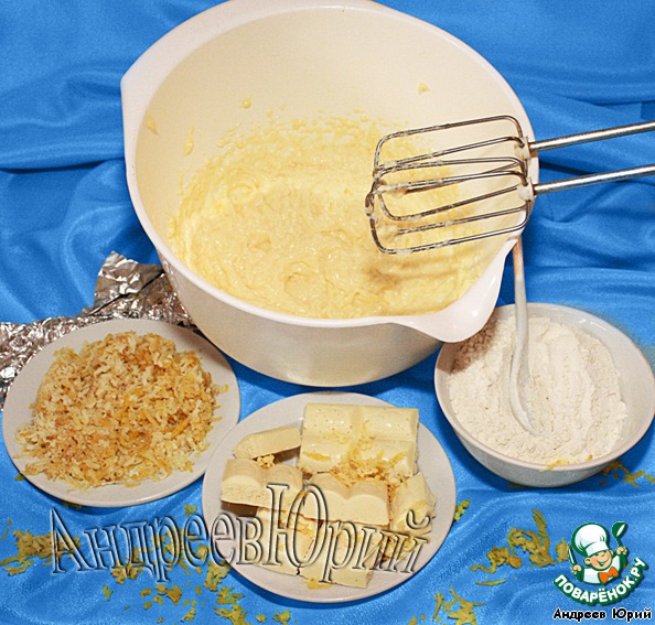 Начнем готовить белое тесто. 50 гр сахара взбить с 1 яйцом, добавить 100 гр сливочного масла, 1 ст. л. сметаны, цедру лимона и хорошо перемешать.