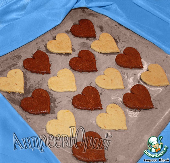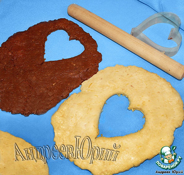 Белое и темное тесто по отдельности раскатать в пласты толщиной в полсантиметра и формочкой вырезать сердечки.
