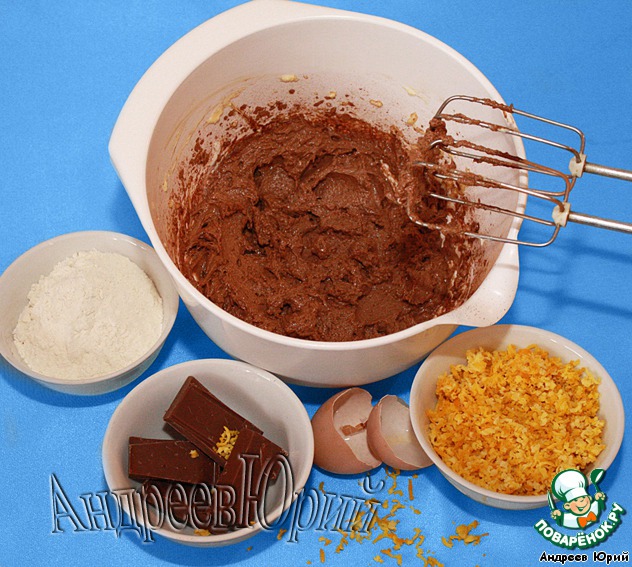 Начнем замешивать темное тесто. 50 гр сахара взбить с 1 яйцом, добавить 100 гр сливочного масла, 2 ст. л. какао, 1 ст. л. сметаны, цедру апельсина и перемешать.