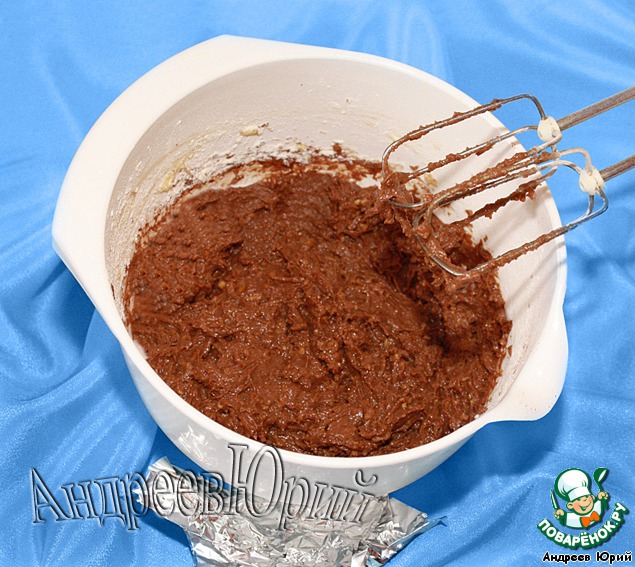 Добавить в тесто растопленный шоколад и 200 гр муки, хорошо перемешать.