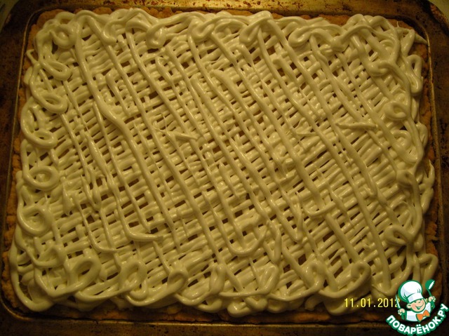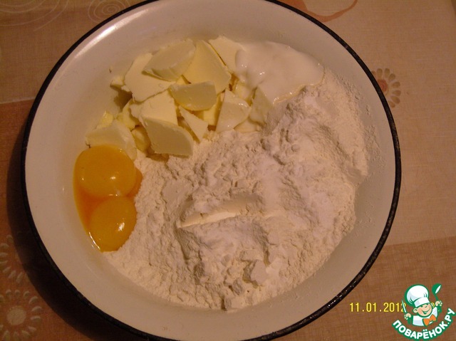 Смешать маргарин, желтки, сметану, муку, соду. Замесить тесто и выложить на противень, запечь в духовке