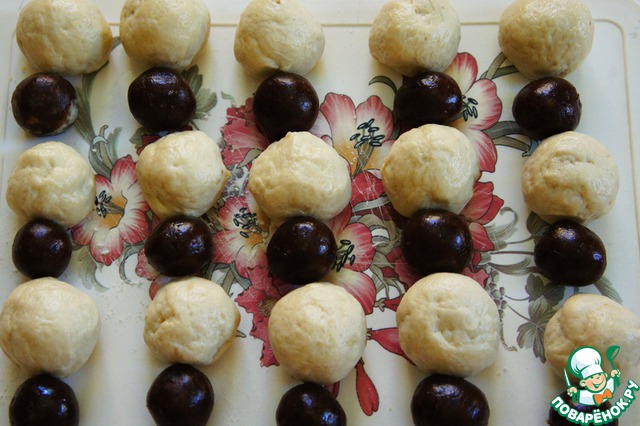 Теперь начинаем формировать печенье. Скатаем из теста шарики размером с грецкий орех, а из финиковой пасты - шарики размером чуть меньше. Чем больше будет шарик из начинки - тем тоньше будет слой теста в печенье. Выбирайте согласно вашим предпочтениям.