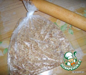 Подготовить начинку. Орехи измельчить. Я делала это при помощи скалки.