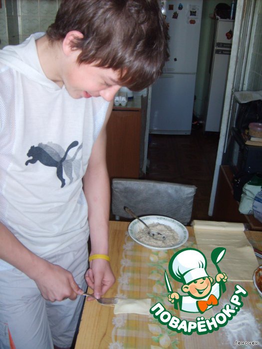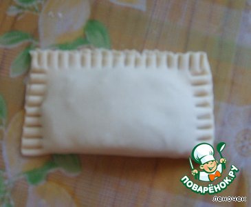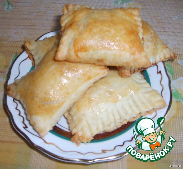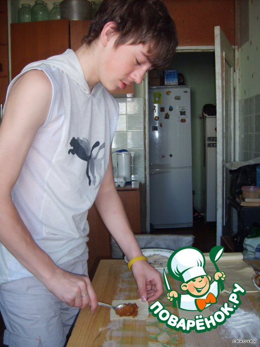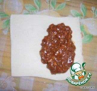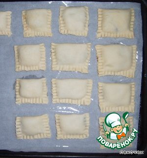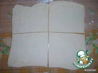 Тесто разморозить при комнатной температуре. Раскатать, разрезать на прямоугольники.